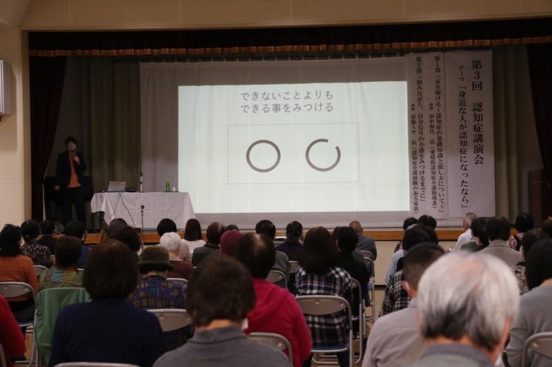 「第3回 認知症講演会」 活動報告 X Facebook はてブ Pocket LINE コピー 2020.11.10 「第3回 認知症講演会」 日 時 令和2年11月1日(日)13:30~15:30 場 所 ウイメンズプラザ新居浜 3階 多目的ホール 参加者 138名(関係者含む) 主 催 新居浜市 地域包括支援センター 共 催 認知症の人と家族の会 愛媛県新居浜支部 社会福祉法人 三恵会 福祉館恵海 社会福祉法人 三恵会 きぼうの苑 社会福祉法人 はぴねす福祉会 NPO法人 ひらめき 新居浜医療福祉生活協同組合 すみの見守り・SOSネットワーク協議会 泉川見守り・SOSネットワーク協議会 内 容 【身近な人が認知症になったなら】 ◎第1部 「耳を傾ける ~認知症の基礎知識と接し方について~」 講師:田中 加代 氏(愛媛県認知症介護指導者) 具体的なエピソードやイラストを交えつつ、認知症の方の感覚について参加者全員で考えました。 認知症の基礎知識と合わせ、認知症当事者に対し、介護者は「できなくなったこと」よりも「できていることに目を向ける」ことの大切を伝えられました。 介護者として「どのようにすることが当事者にとって良いのか」を考えるは、本人の尊厳にもつながります。 介護者のリフレッシュも大切として、「笑い」の大切さについても触れられていました。 ◎第2部 「悩みながら、自分なりの介護をみつけるまでに」 講師:齋藤 ミヤ氏(傾聴ボランティア顧問) 認知症の家族を介護する中で感じた、「認知症についての正しい予備知識を持つ」と「認知症になっても心は残っている」ということ。 一番近い家族だからこそ感じる葛藤を踏まえ、周りの助けを得ながら、たどり着いた「穏やかで、温かい介護の大切さ」についてご講演いただきました。 ◎講演会参加者からの声~認知症の人を地域で見守りあうために、私たちにできること~ ・認知症について正しい知識を持つ ・まずは「あいさつ」からはじめる ・根気よく、ゆっくり話を聞く ・ゆったりした気持ちで、その方に寄り添う ・普通に笑顔で接する ・近所づきあいを大切にする ◎市民の皆さまへ 認知症は誰もがなり得る可能性のある「病気」です。 認知症を恐れるのではなく、認知症になっても地域で生活し続けることができるよう、一人ひとりが認知症について「考える」こと、声かけなど「行動する」ことを生活の中で、意識していただけると幸いです。 誰もがなり得る可能性があるからこそ、地域全体で「認知症に備える取り組み」が大切です。 地域包括支援センターでは認知症の「予防」から、発症後の「支援」に至るまで様々な相談に対応しております。 また、地域での見守り合いを広めていくために、認知症サポーター養成講座や認知症高齢者見守りSOSネットワーク等を実施しております。