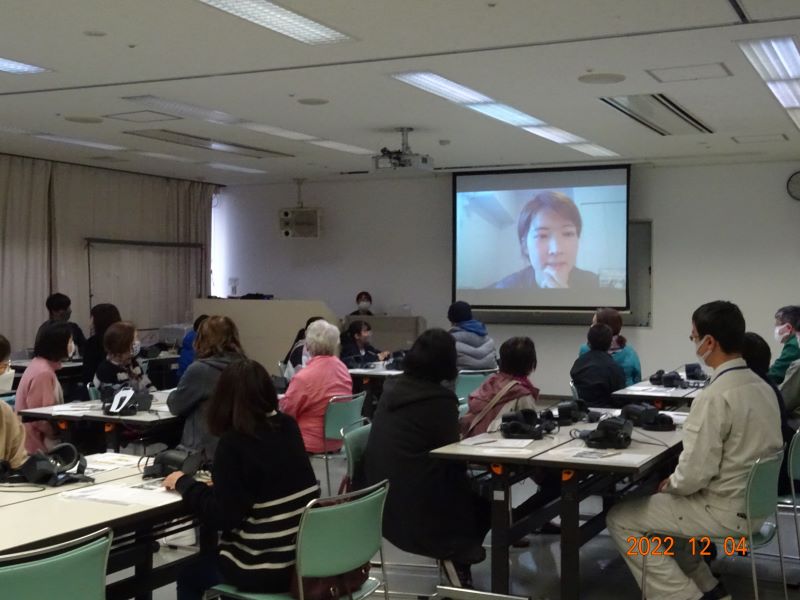 「認知症VR体験会」 活動報告 X Facebook はてブ Pocket LINE コピー 2023.01.10 「認知症VR体験会」 日 時 令和4年12月1日(日)・1回目 10:30~12:00・2回目 14:00~15:30 場 所 総合福祉センター 2階 研修室1 参加者 60名(各回30回) 内 容 株式会社シルバーウッド VR認知症ファシリテーターを講師にお迎えし、VR(バーチャルリアリティ)を使用し、認知症の3つの症状を体験し、体験ごとに参加者同士で「本人の視点に立ったときに何を感じ、何を思ったか」を話し合いました。さらに認知症当事者の方のインタビューを聞き、認知症がある方を取り巻く問題の本質に迫りました。 参加者からは、 「認知症の人の不安な気持ちが分かり、どのように声掛けをしたら良いのか、考える機会になった」 「認知症を隠さなくて良い社会になってほしい」 「まずは本人の話をよく聞き、不安なことを見つけて改善していきたい」 という声が聞かれました。