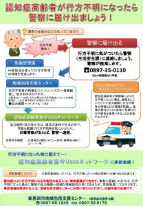 新居浜市全体での取り組みと連動して、角野校区と泉川校区では、認知症になっても安心して暮らせる地域づくりを目指した、住民主体で、認知症を正しい理解をするための広報、捜索、捜索模擬訓練などの活動を行っています。